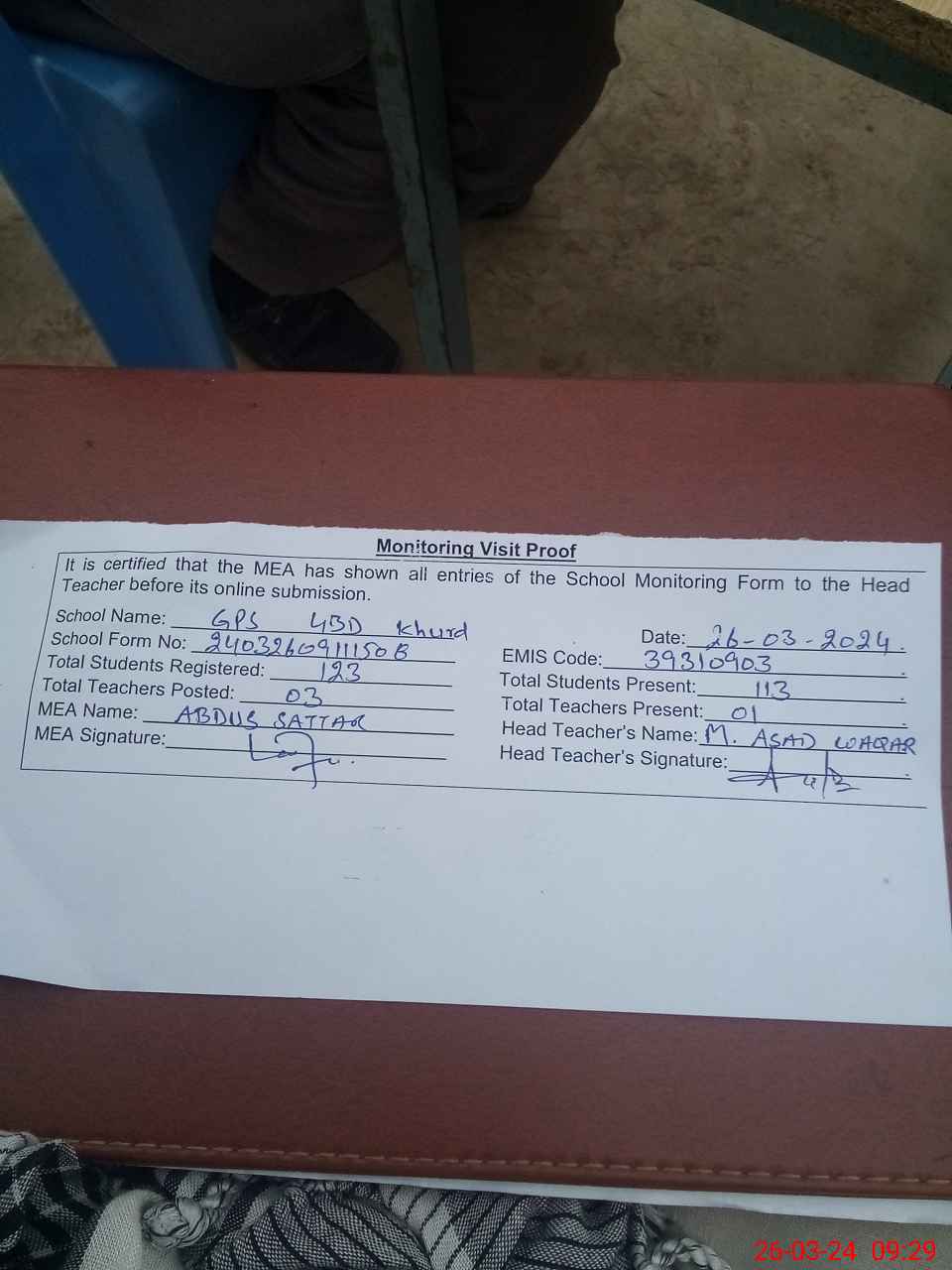 | Attendance Register | Head Teacher | MEA with School | Visit Proof |