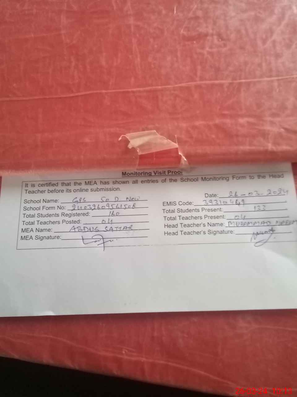 | Attendance Register | Head Teacher | MEA with School | Visit Proof |