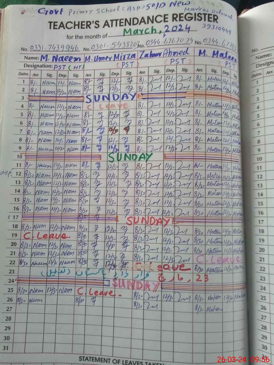 | Leave | Duty | Absent | Maternity | Medical | Ex- Pak |