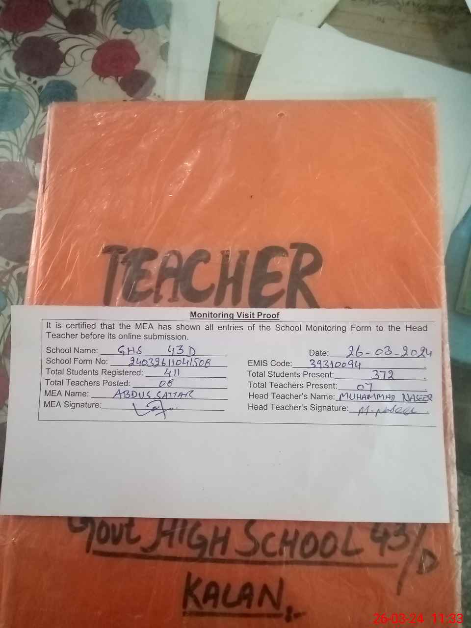 | Attendance Register | Head Teacher | MEA with School | Visit Proof |