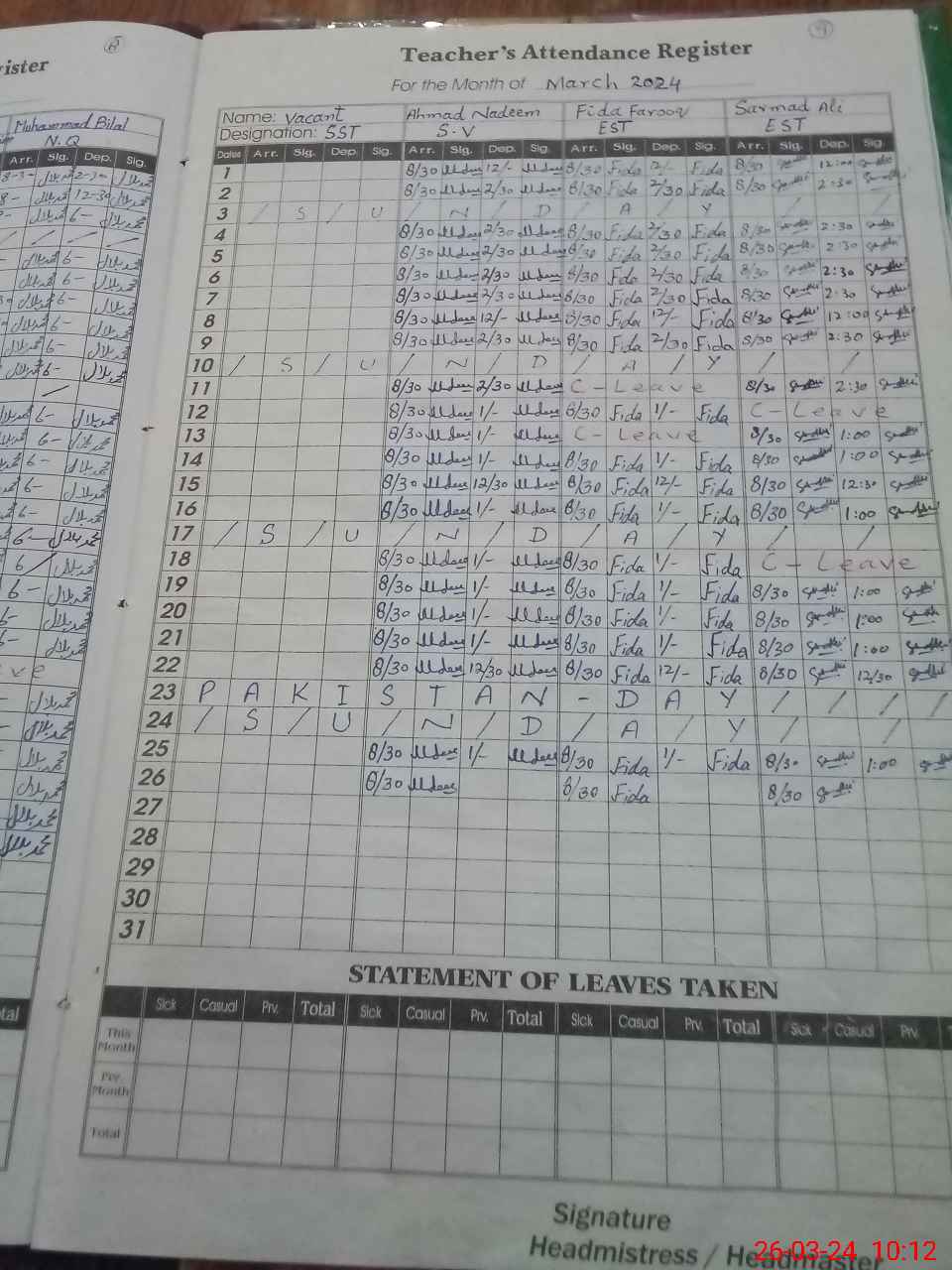 | Leave | Duty | Absent | Maternity | Medical | Ex- Pak |
