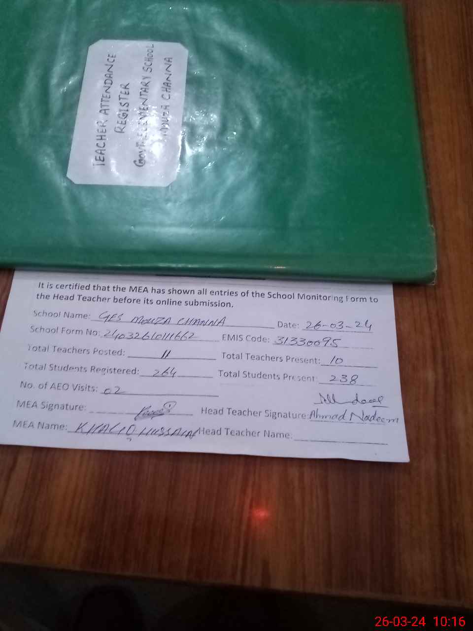 | Attendance Register | Head Teacher | MEA with School | Visit Proof |