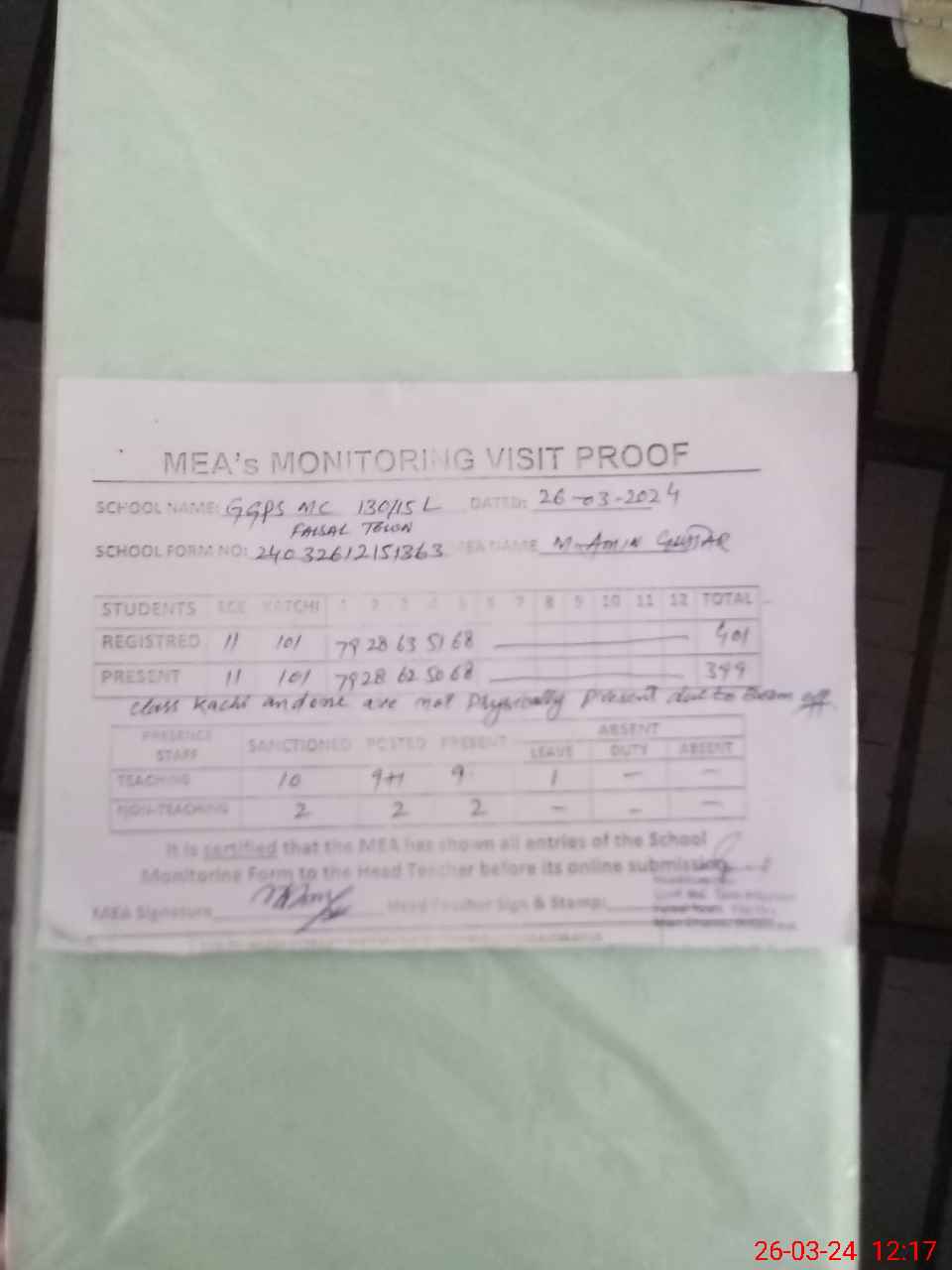 | Attendance Register | Head Teacher | MEA with School | Visit Proof |