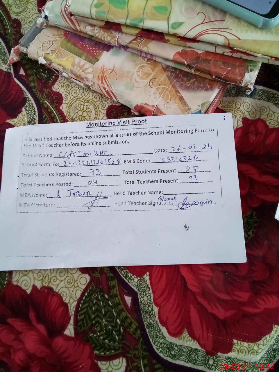 | Attendance Register | Head Teacher | MEA with School | Visit Proof |