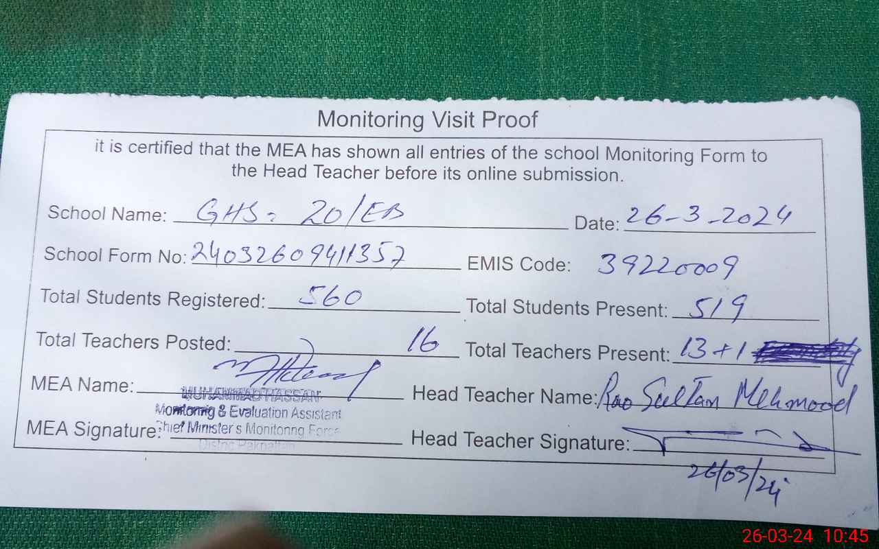 | EMIS Code: 39220009 | Name of School: GHS CHAK NO. 20/EB ARIFWALA | |||