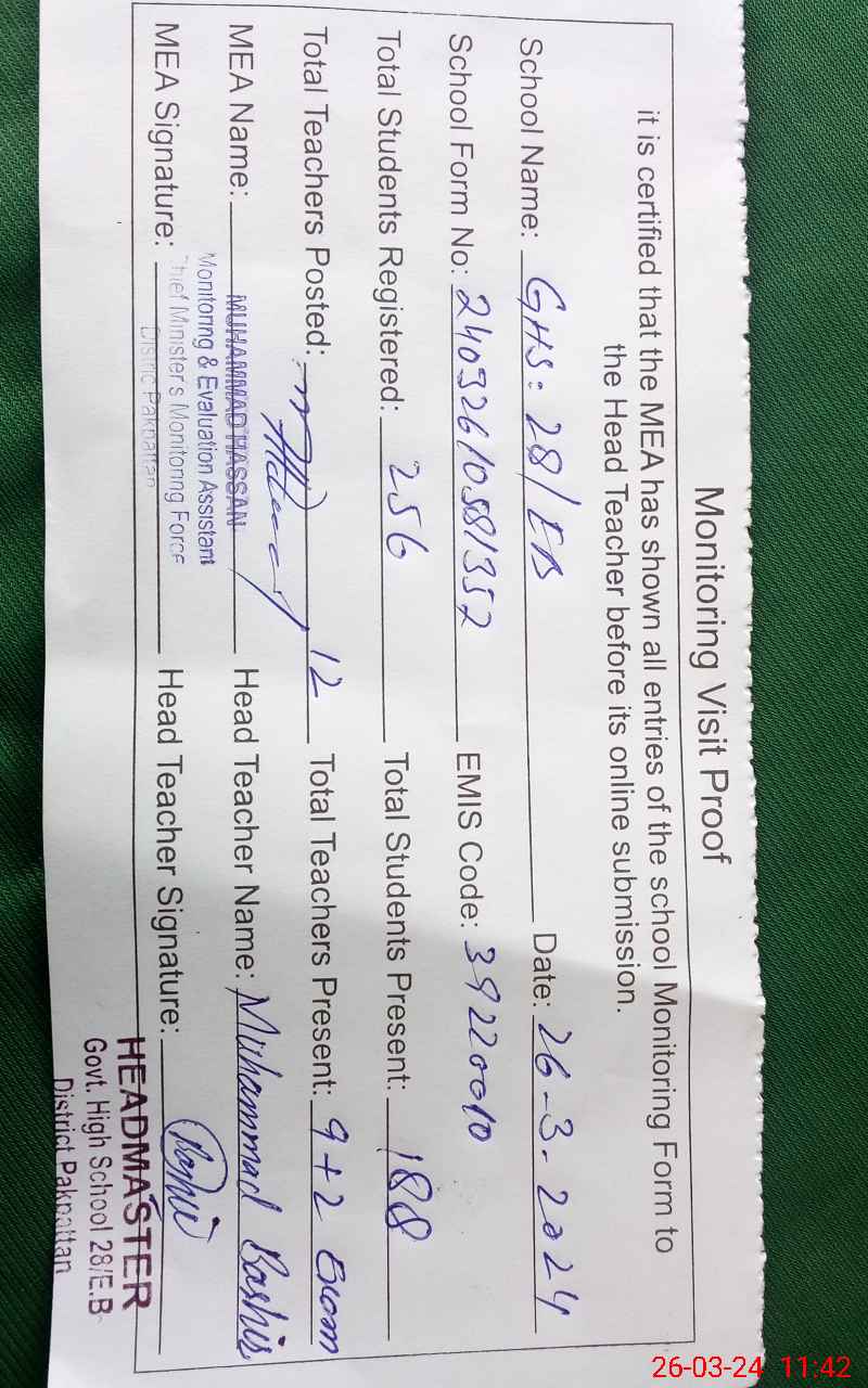 | EMIS Code: 39220010 | Name of School: GHS 28 EB TEH ARIF WALA | |||