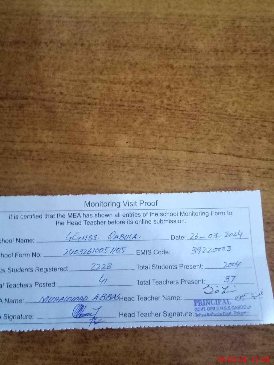 | Certified that this School was Inspected by the Undersigned MEA/DMO Today and the Information Stated Above is as Per Record. | |||||