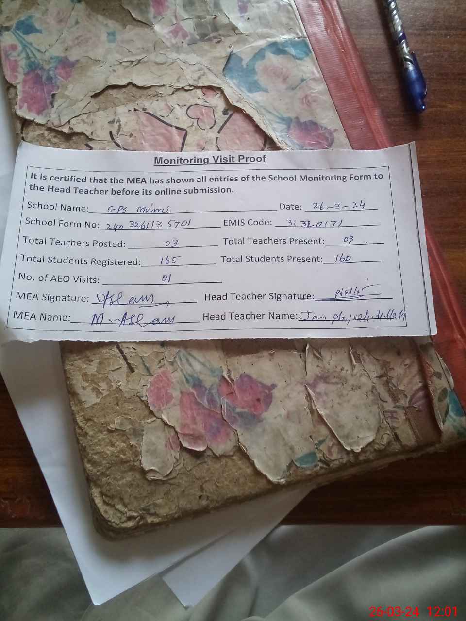 | Attendance Register | Head Teacher | MEA with School | Visit Proof |