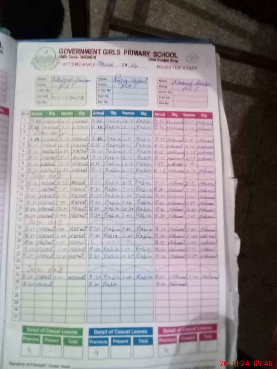 | CNIC | Full Name | Designation | R/C | Absence During Last Calender Month |