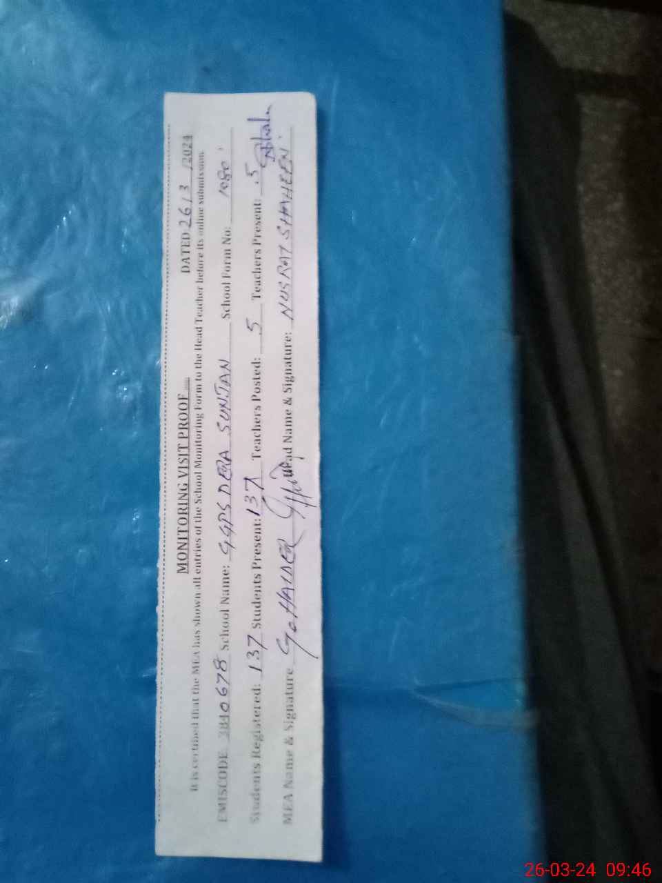 | Attendance Register | Head Teacher | MEA with School | Visit Proof |