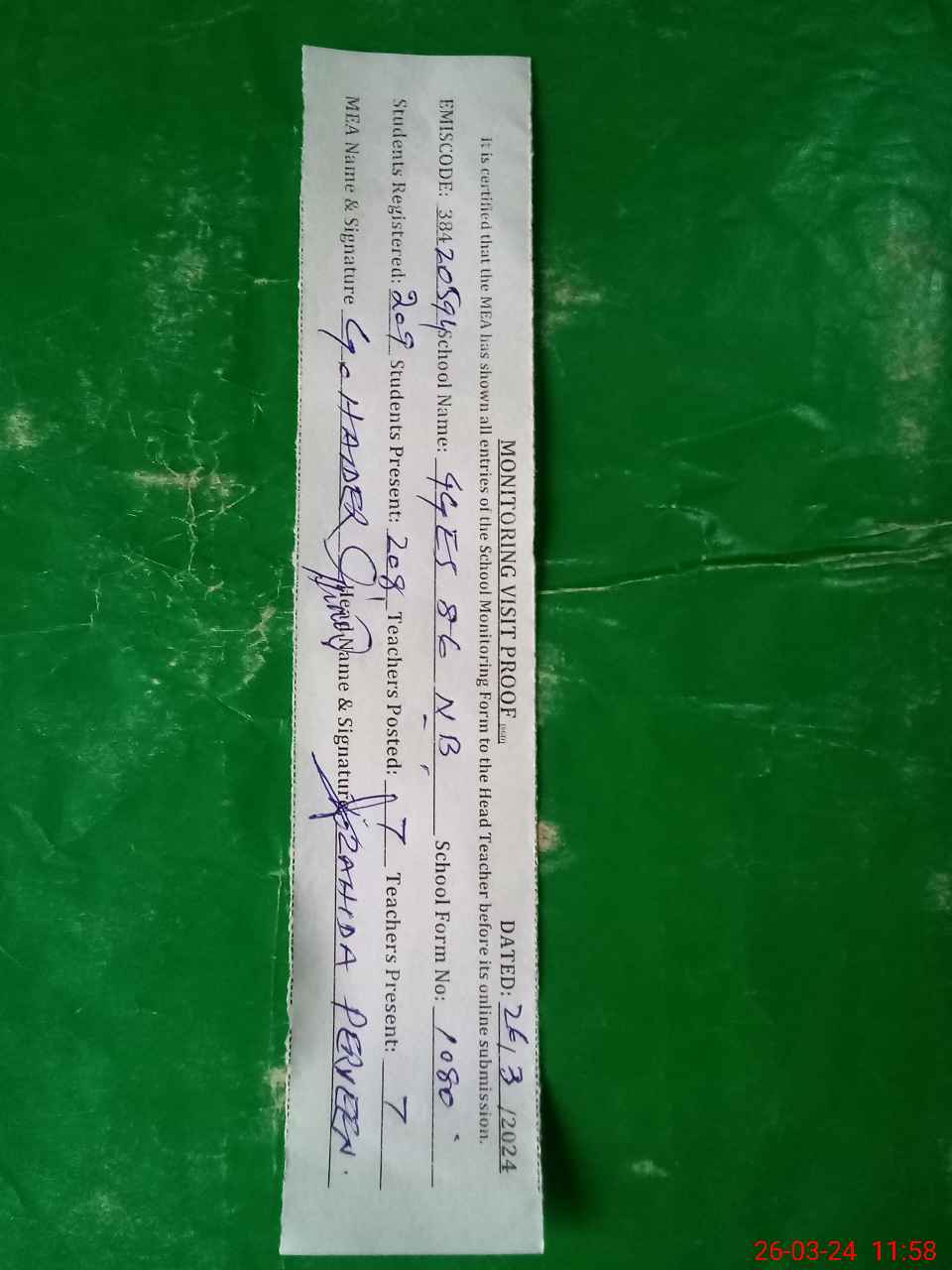 | Attendance Register | Head Teacher | MEA with School | Visit Proof |