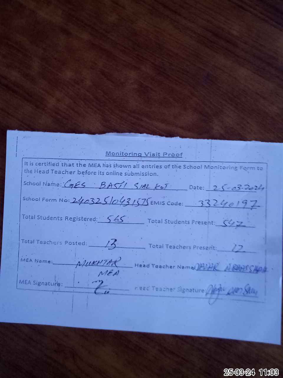 | Attendance Register | Head Teacher | MEA with School | Visit Proof |