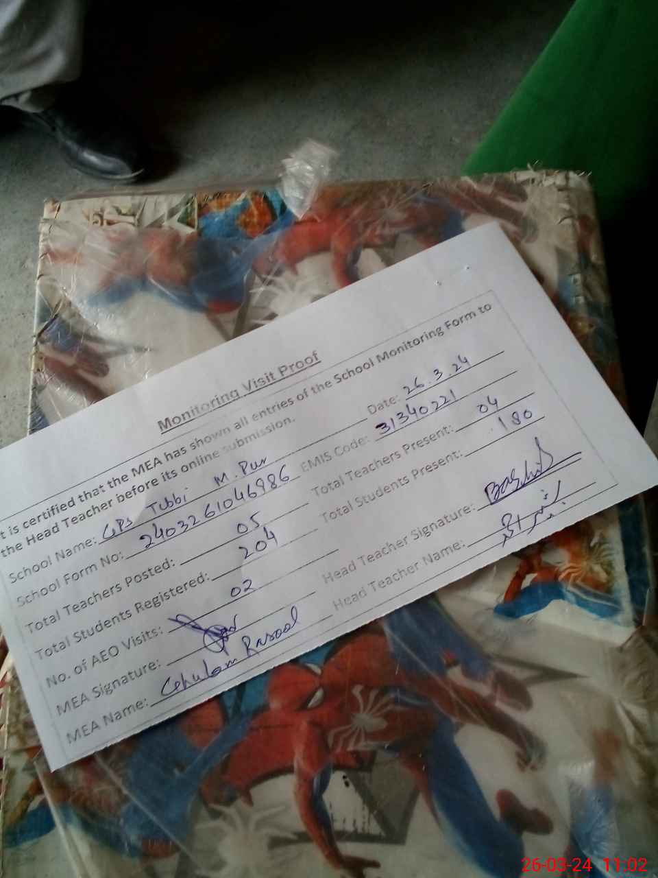 | Attendance Register | Head Teacher | MEA with School | Visit Proof |