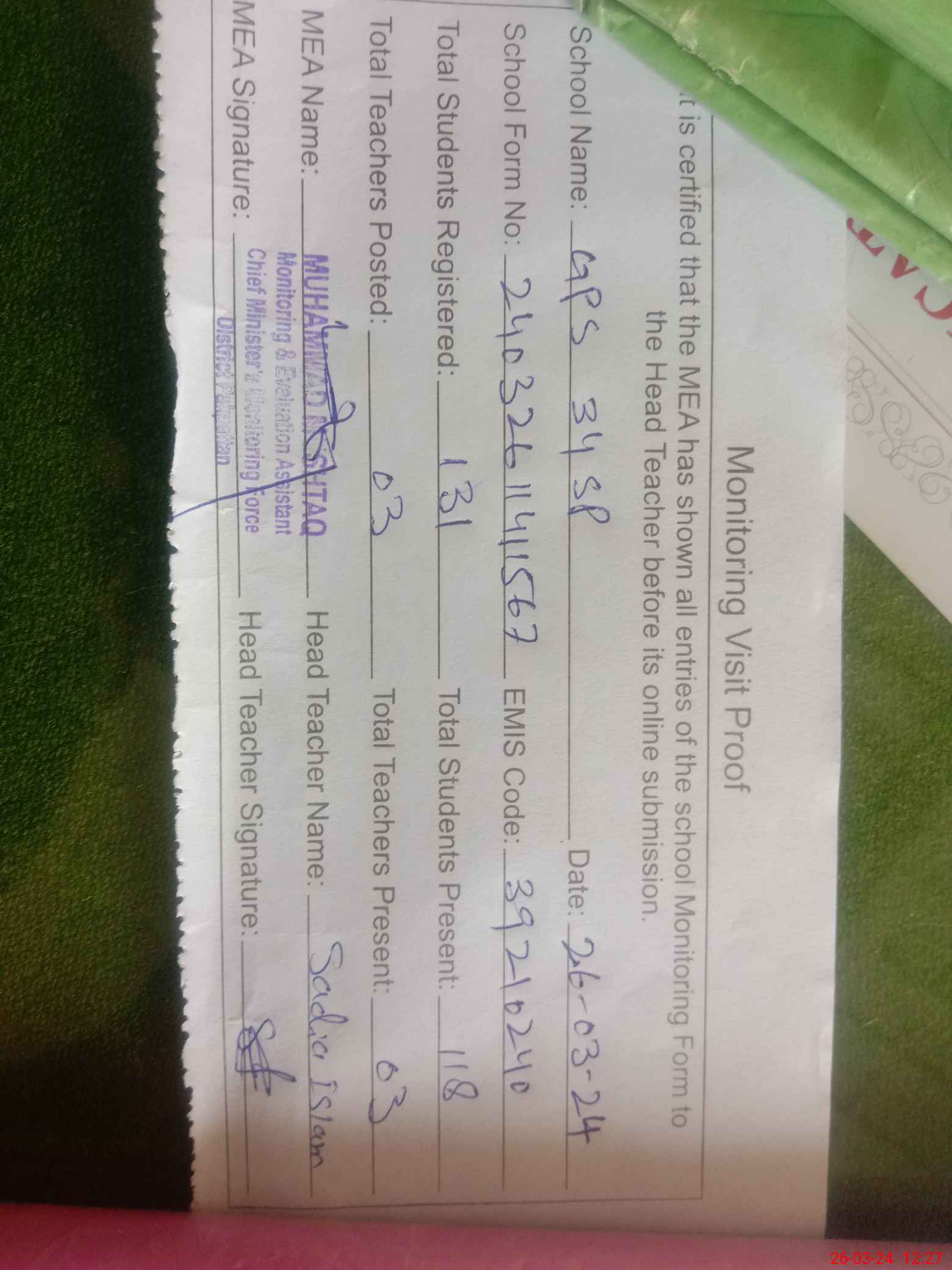 | Attendance Register | Head Teacher | MEA with School | Visit Proof |