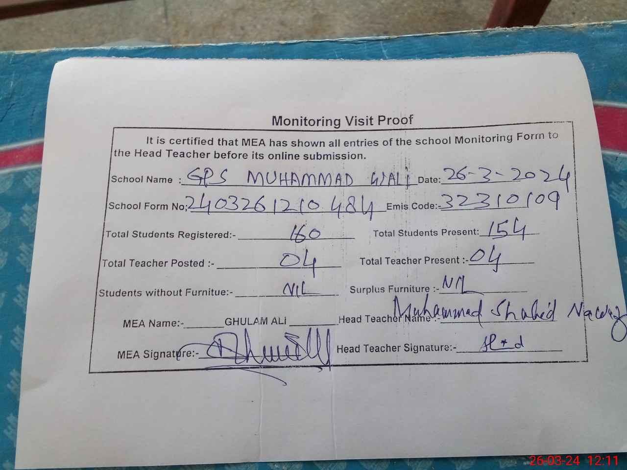 | EMIS Code: 32310109 | Name of School: GPS MUHAMMAD WALI | |||