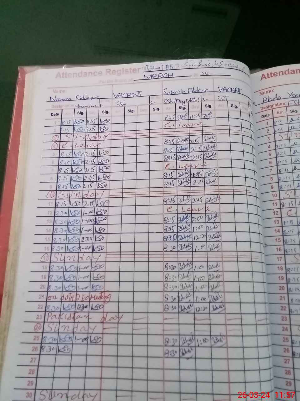 | Leave | Duty | Absent | Maternity | Medical | Ex- Pak |