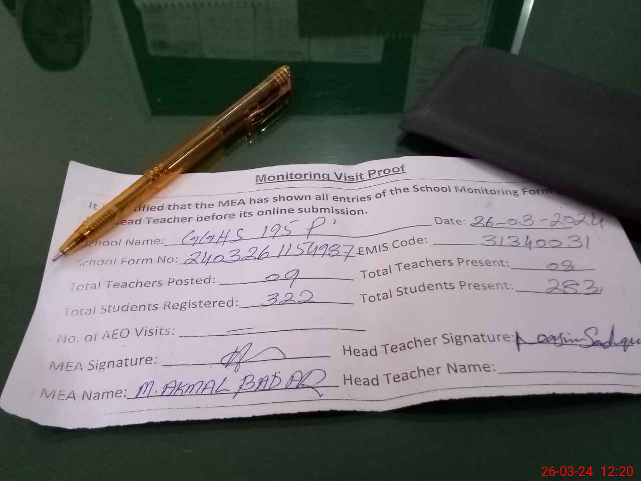 | Attendance Register | Head Teacher | MEA with School | Visit Proof |