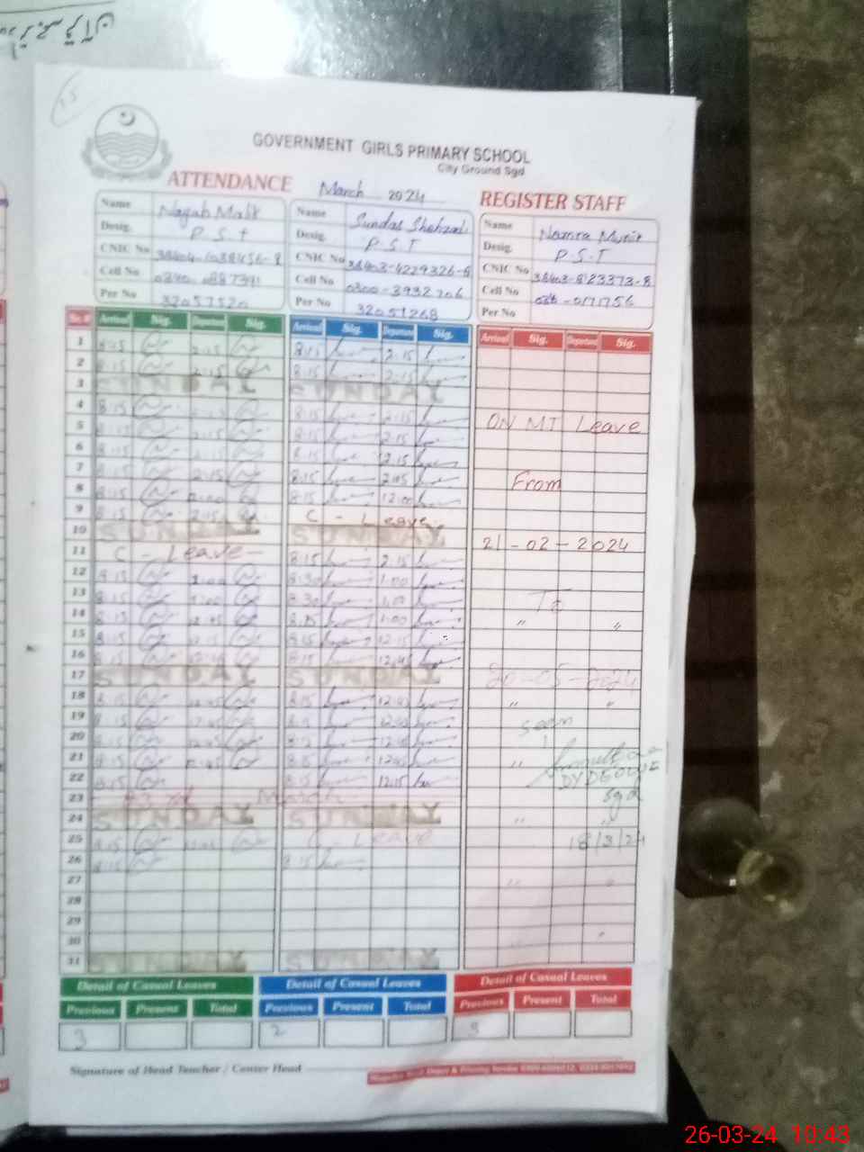 | CNIC | Full Name | Designation | R/C | Absence During Last Calender Month |