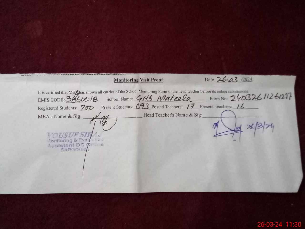 | EMIS Code: 38460018 | Name of School: GHS MATEELA | |||