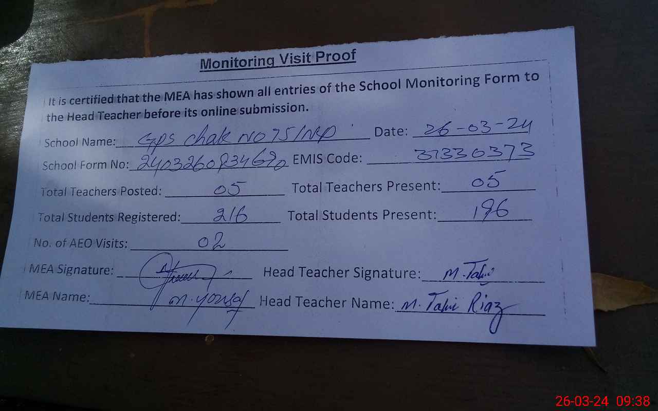 | EMIS Code: 31330373 | Name of School: GPS CHAK 75/NP | |||