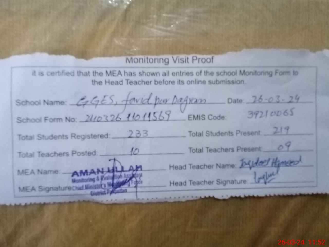 | Attendance Register | Head Teacher | MEA with School | Visit Proof |