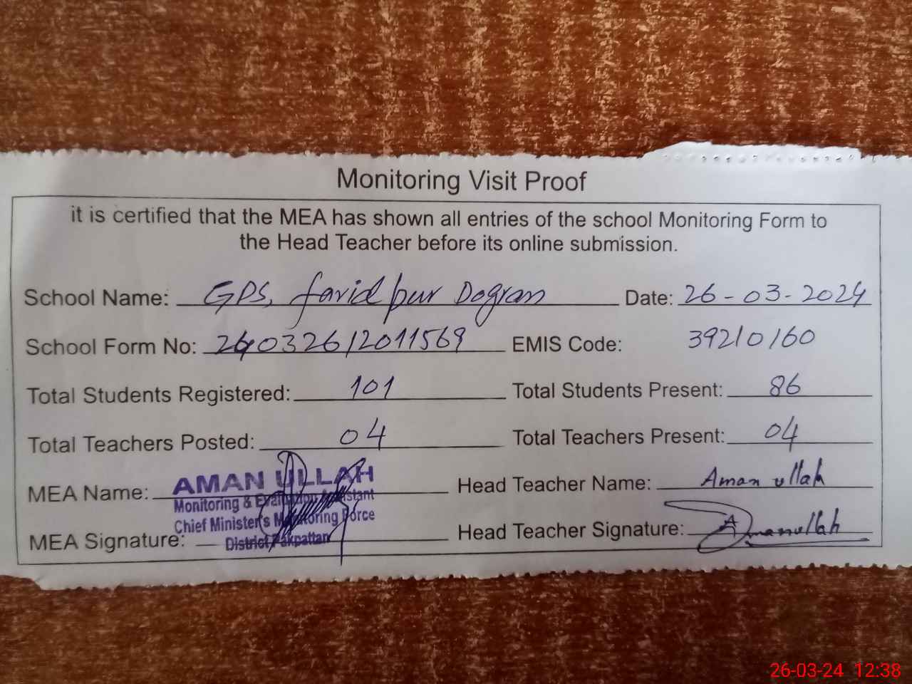 | EMIS Code: 39210160 | Name of School: GPS FARID PUR DOGRAN | |||