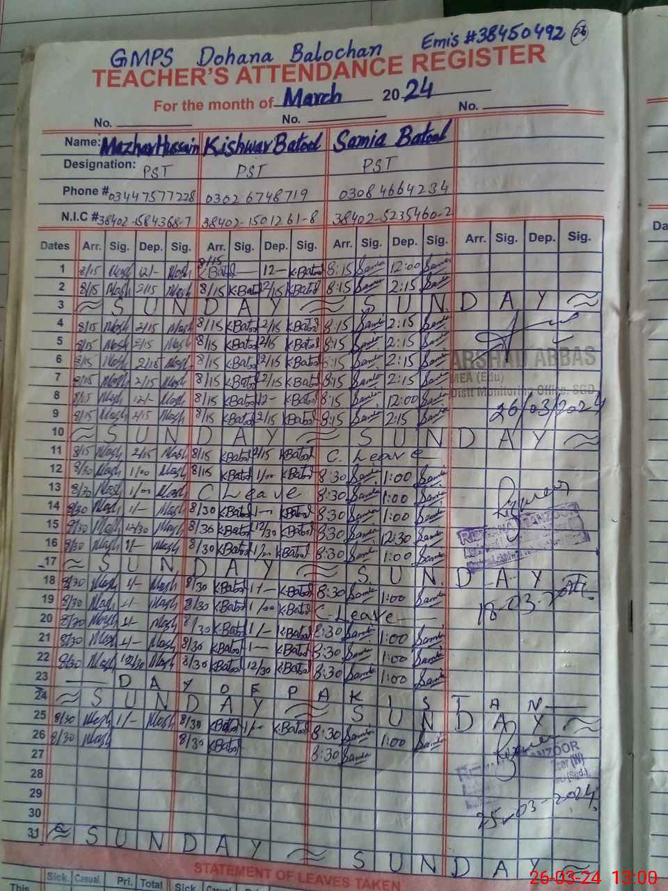| Name: SA**** BA**** Designation: (School Headmaster's/Headmistress's) PST Phone/Cell Number: 03**** |