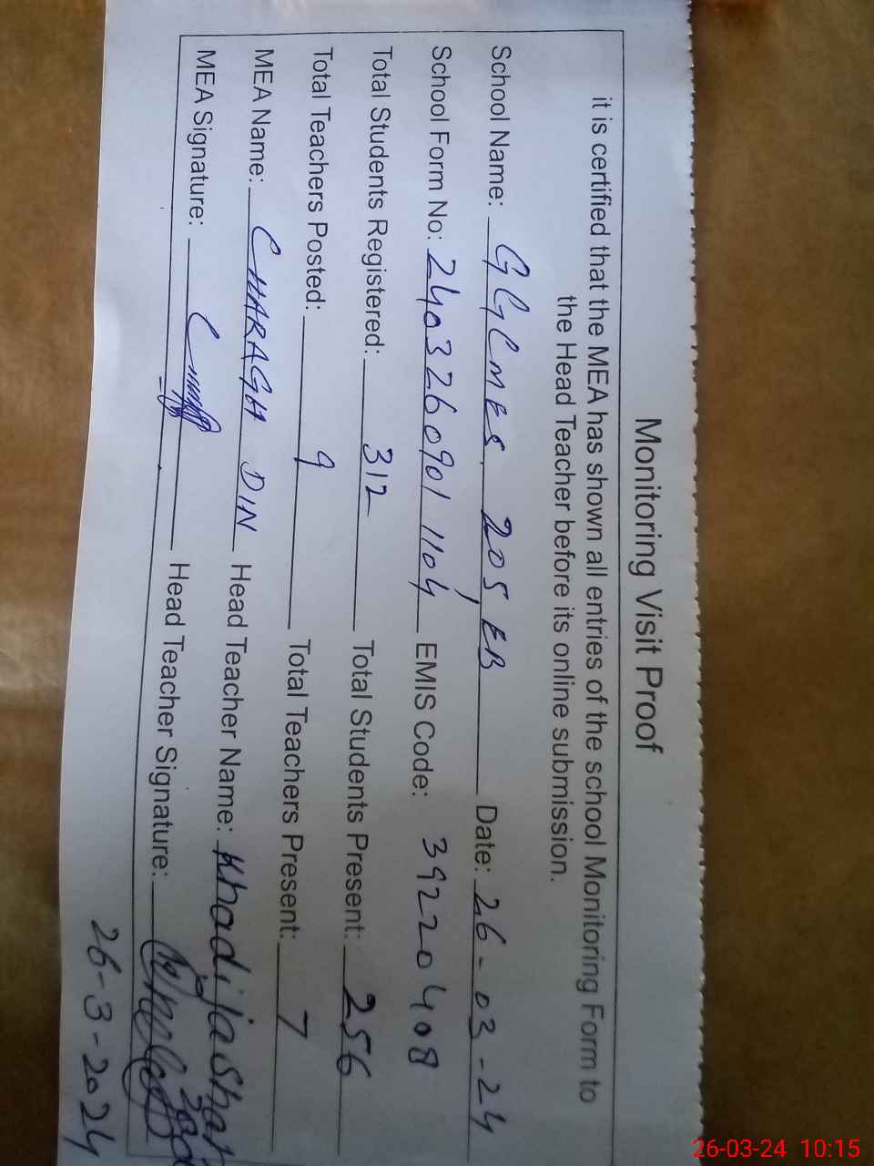 | Attendance Register | Head Teacher | MEA with School | Visit Proof |