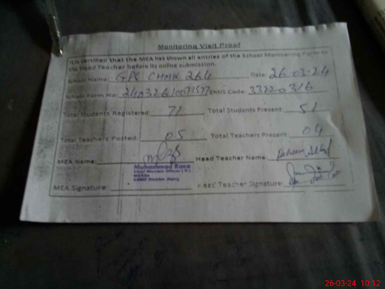 | Attendance Register | Head Teacher | MEA with School | Visit Proof |