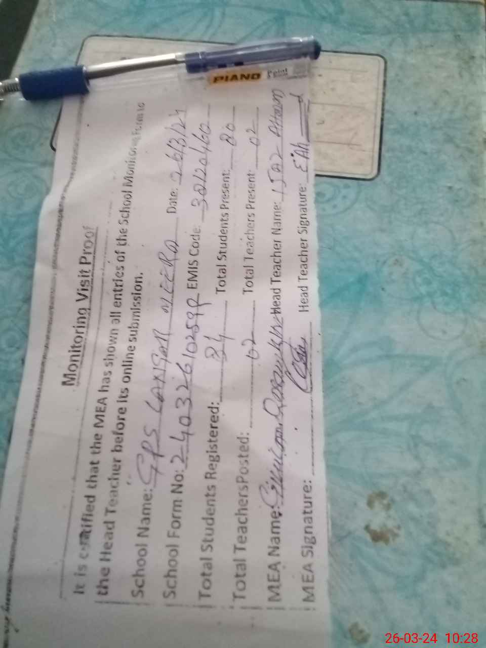 | Attendance Register | Head Teacher | MEA with School | Visit Proof |