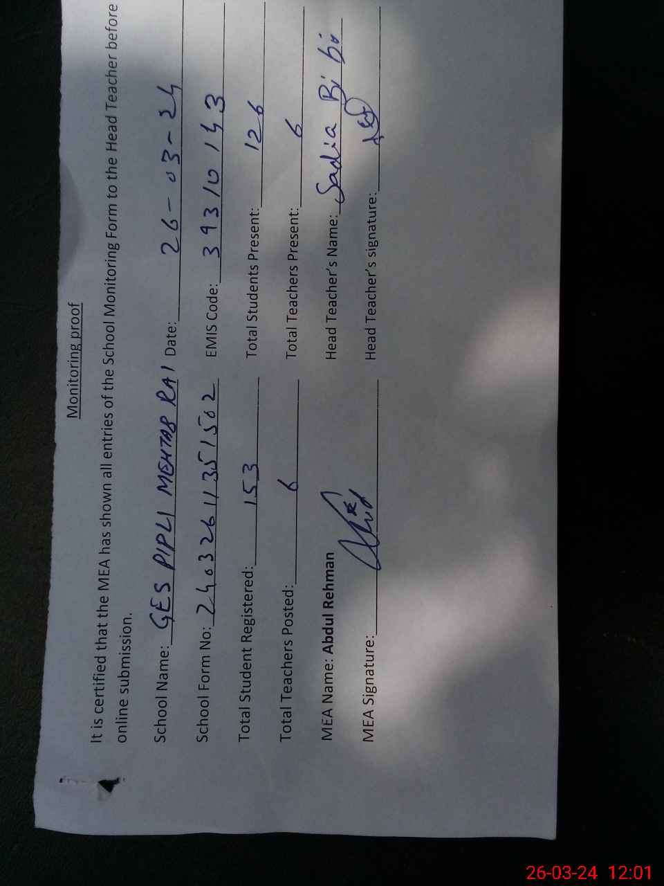 | Attendance Register | Head Teacher | MEA with School | Visit Proof |