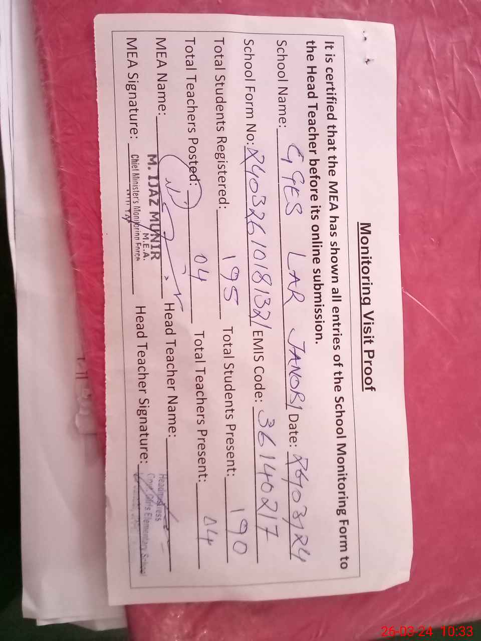 | Certified that this School was Inspected by the Undersigned MEA/DMO Today and the Information Stated Above is as Per Record. | |||||
