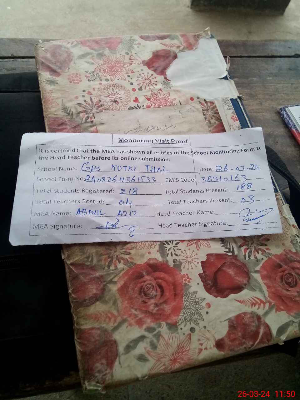 | Attendance Register | Head Teacher | MEA with School | Visit Proof |