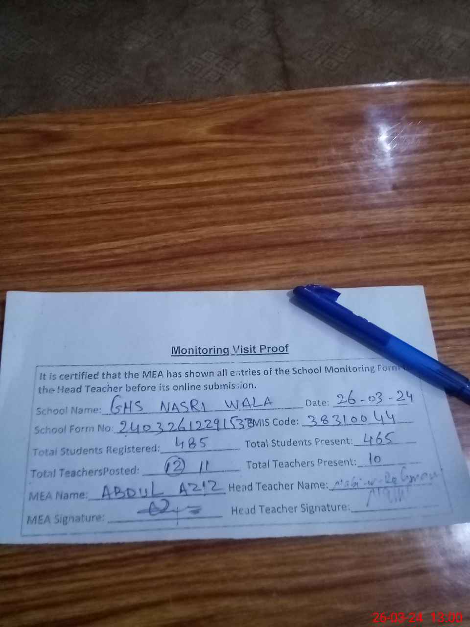 | Attendance Register | Head Teacher | MEA with School | Visit Proof |