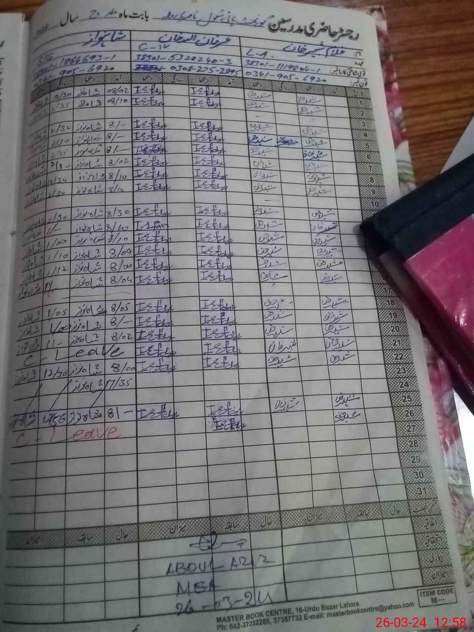 | CNIC | Full Name | Designation | R/C | Absence During Last Calender Month |