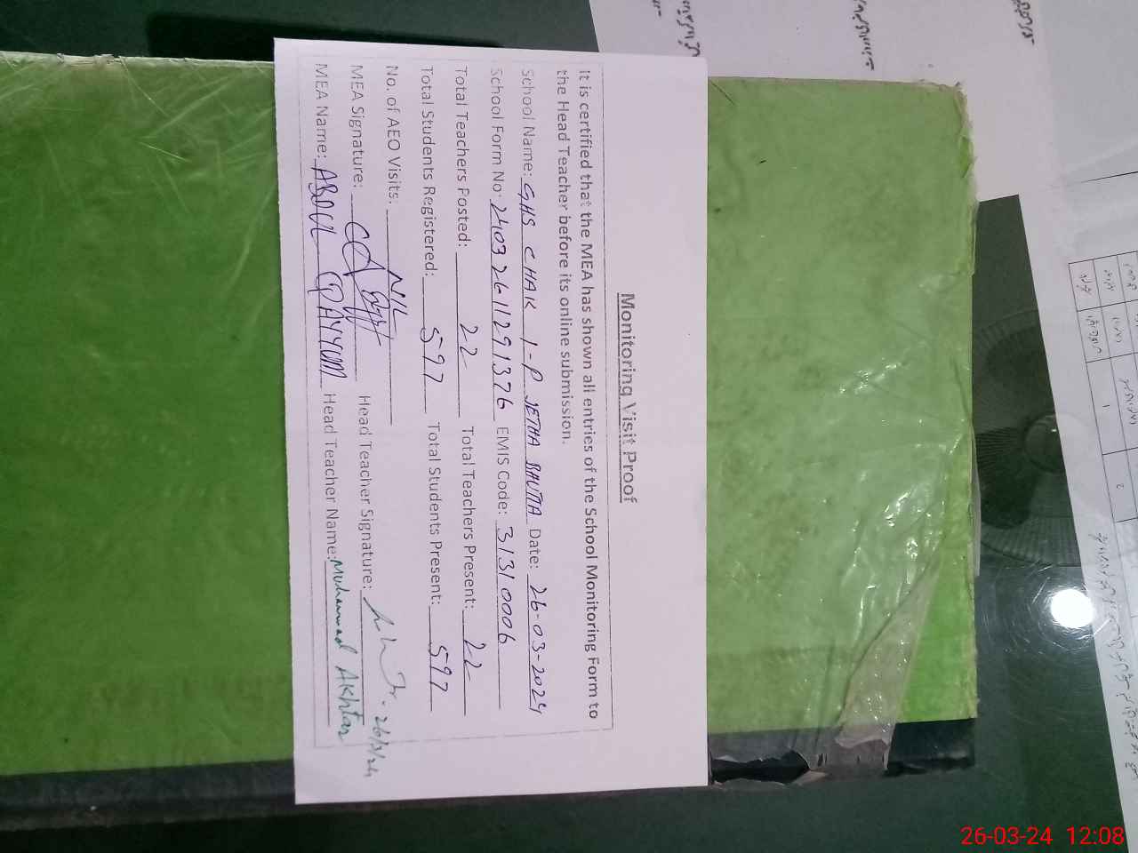 | Attendance Register | Head Teacher | MEA with School | Visit Proof |