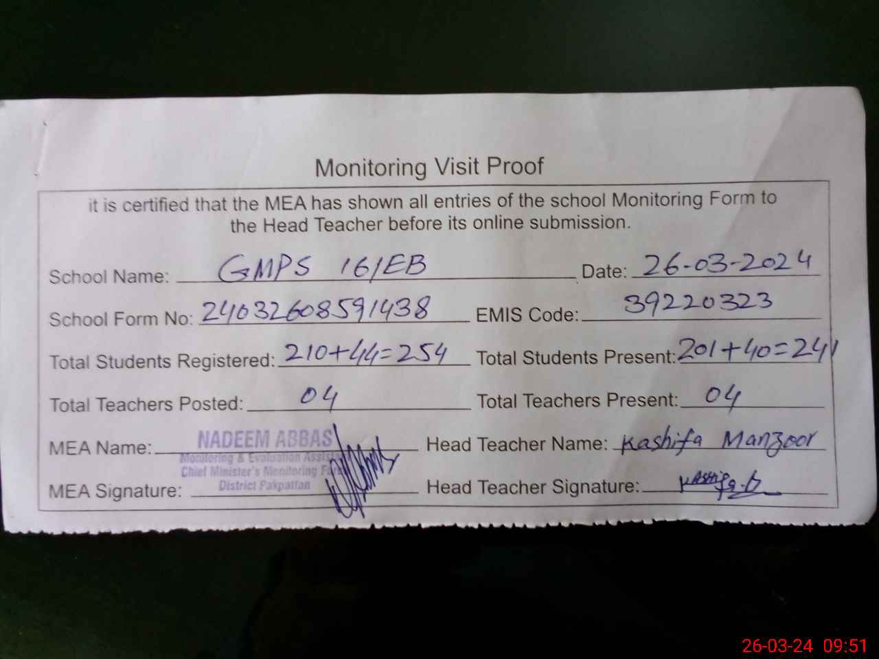 | Certified that this School was Inspected by the Undersigned MEA/DMO Today and the Information Stated Above is as Per Record. | |||||