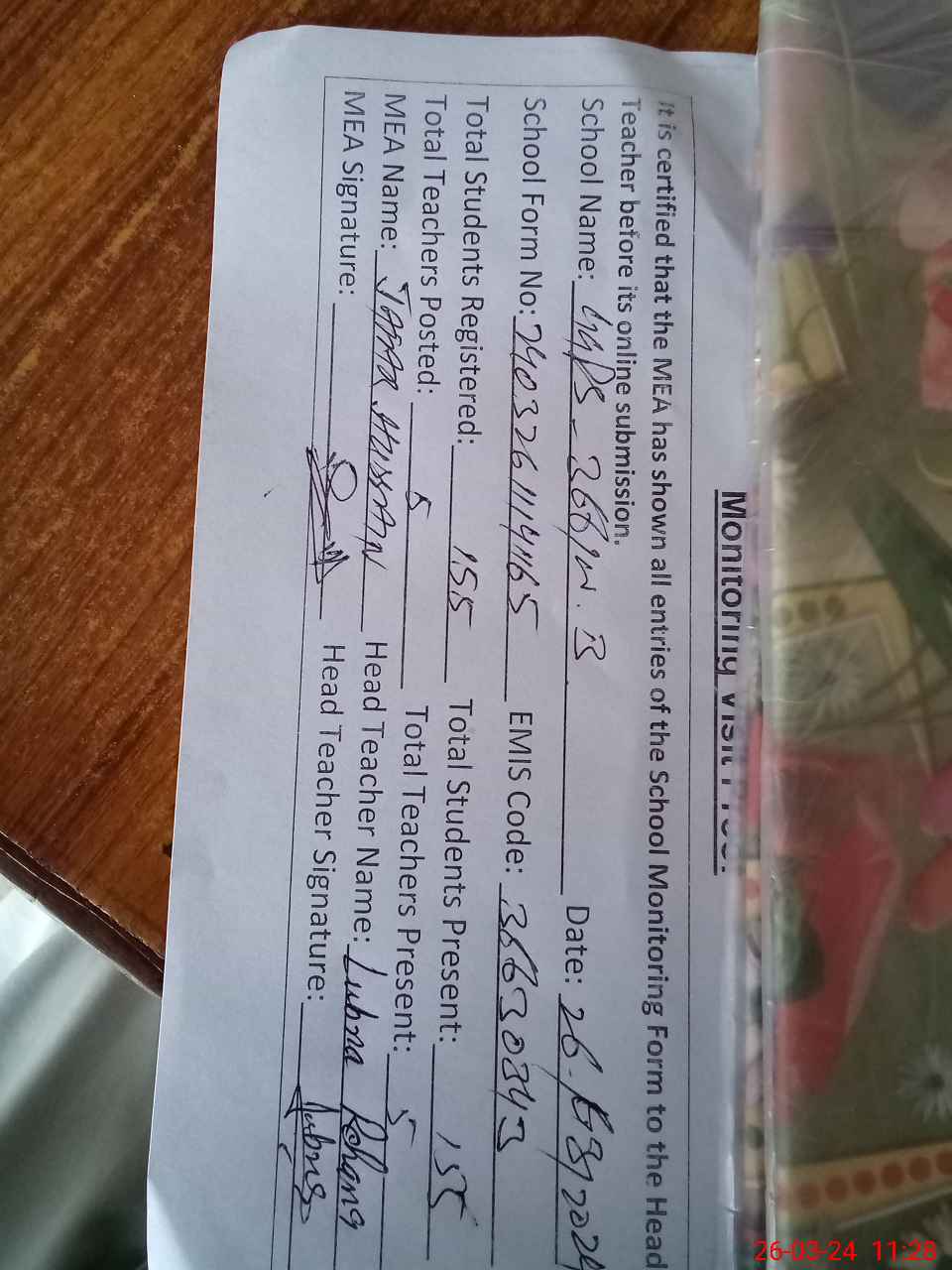 | Attendance Register | Head Teacher | MEA with School | Visit Proof |