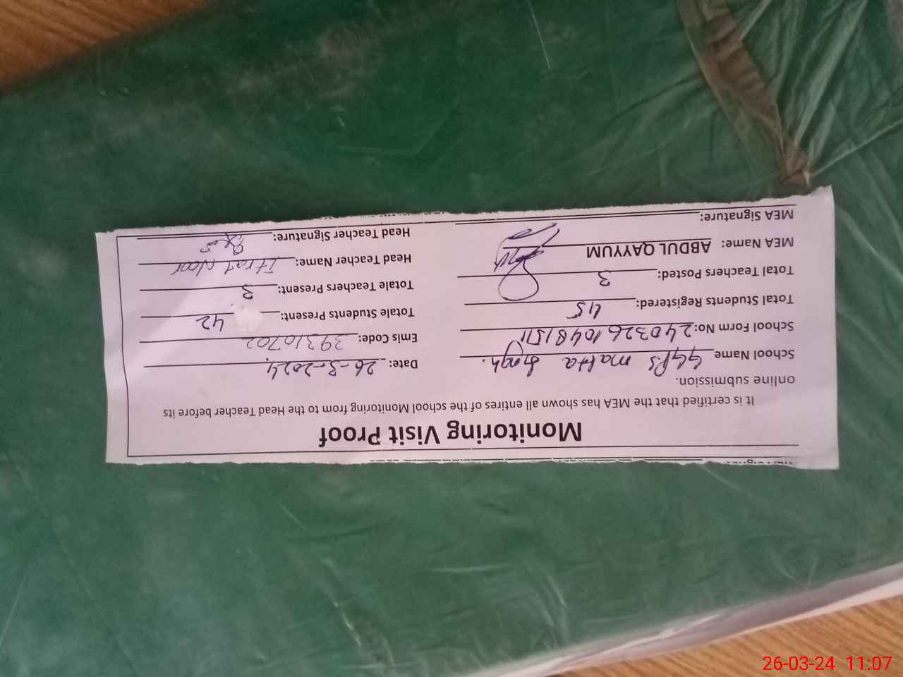 | Attendance Register | Head Teacher | MEA with School | Visit Proof |