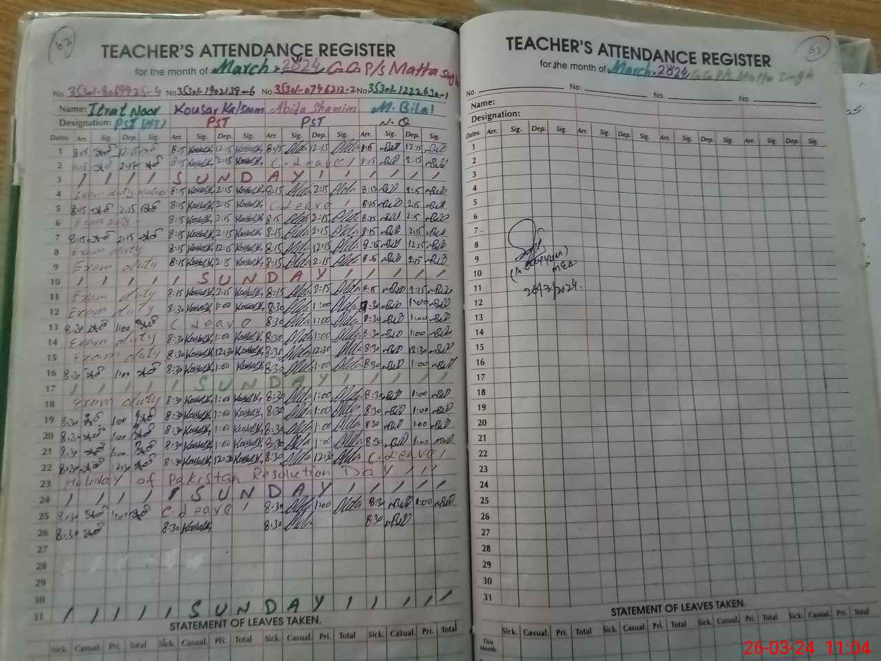| Leave | Duty | Absent | Maternity | Medical | Ex- Pak |