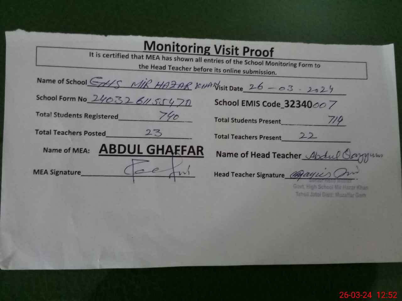 | EMIS Code: 32340007 | Name of School: GHS MIR HAZAR KHAN | |||
