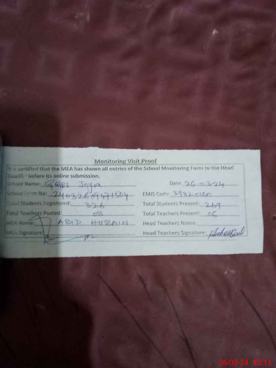 | Certified that this School was Inspected by the Undersigned MEA/DMO Today and the Information Stated Above is as Per Record. | |||||