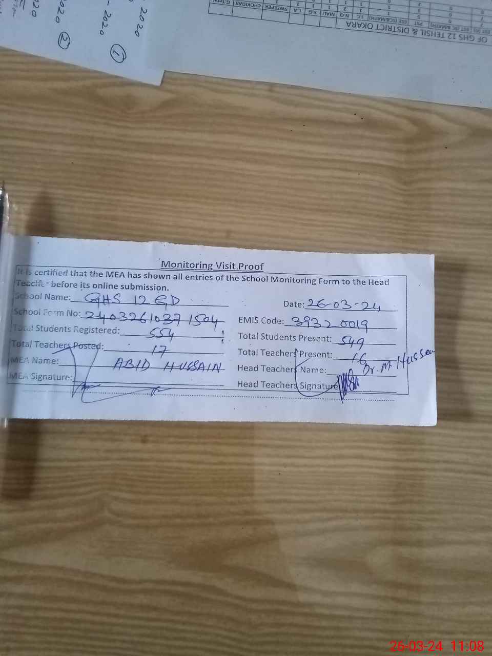 | Attendance Register | Head Teacher | MEA with School | Visit Proof |