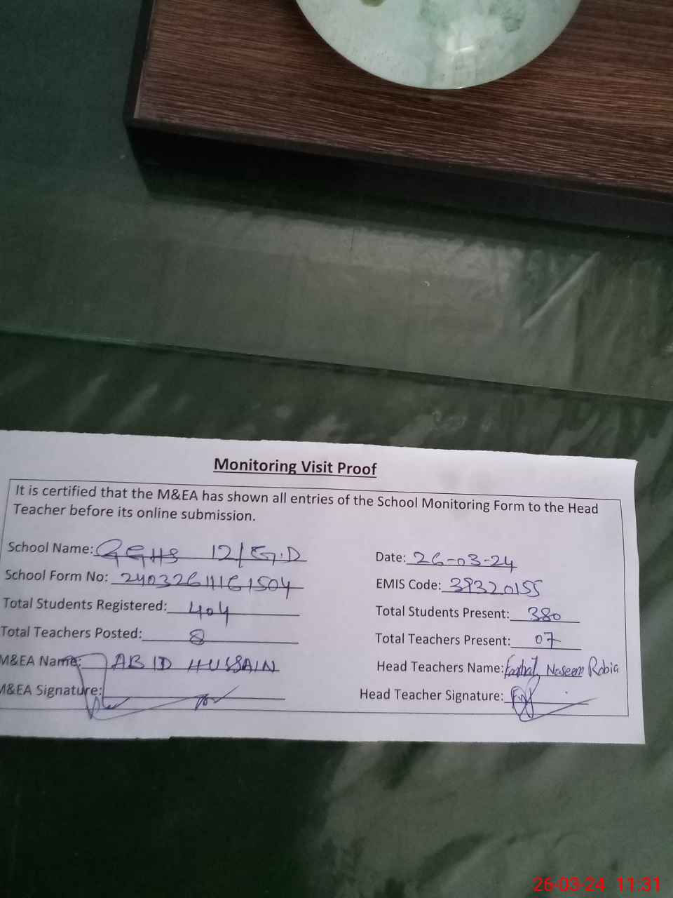 | Attendance Register | Head Teacher | MEA with School | Visit Proof |