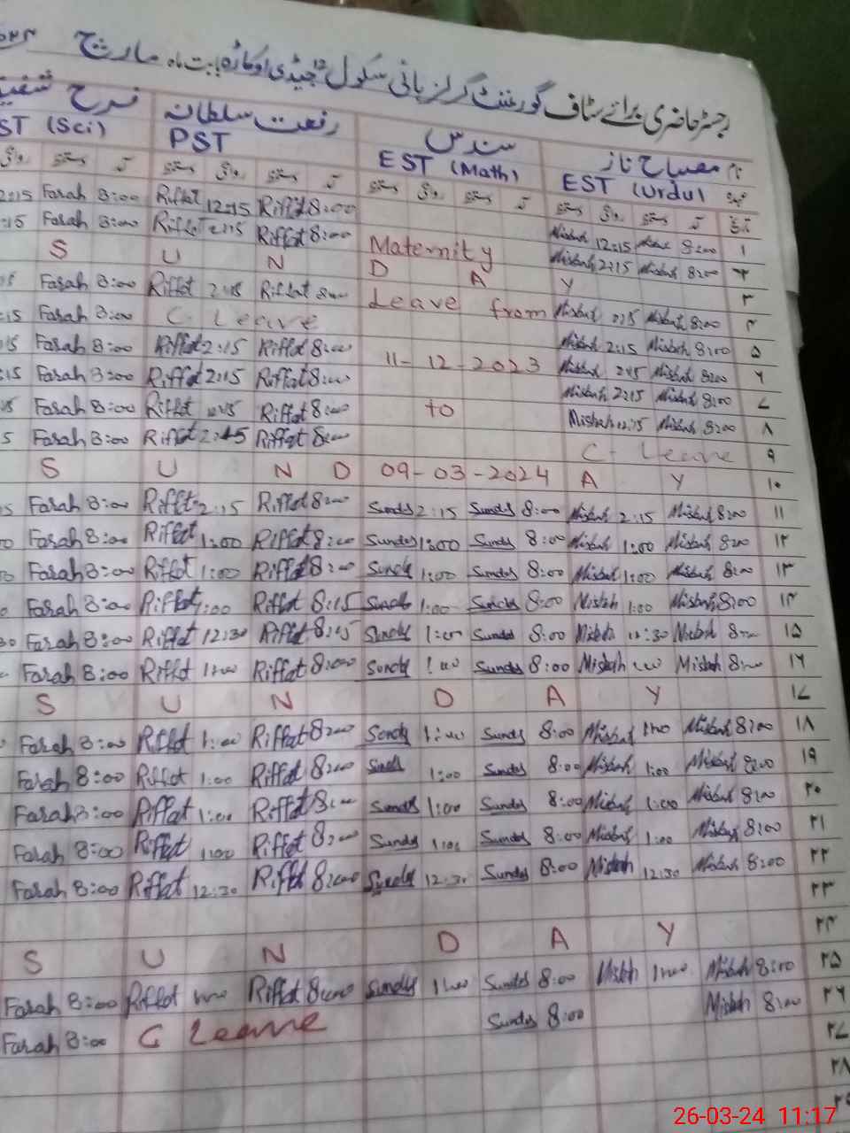 | Leave | Duty | Absent | Maternity | Medical | Ex- Pak |