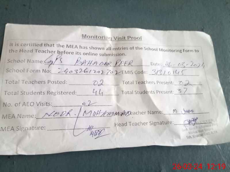 | EMIS Code: 31310145 | Name of School: GPS BAHADUR PEER | |||