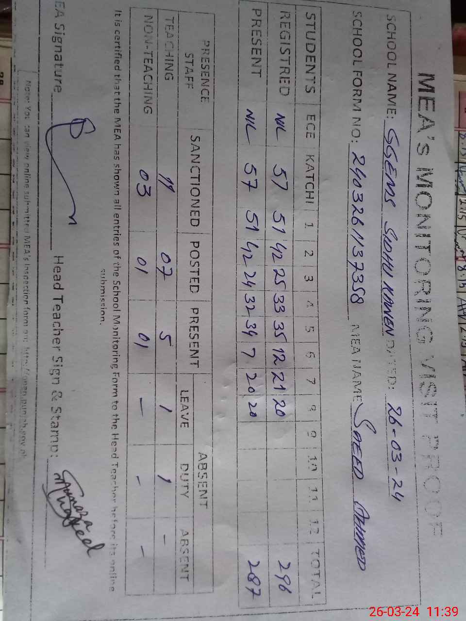 | Monitoring Date: 26-03-2024 | Start Time: 26-03-2024 11:10 AM | End Time: 26-03-2024 11:42 AM | Name of MEA: Sa**** Ah**** | |