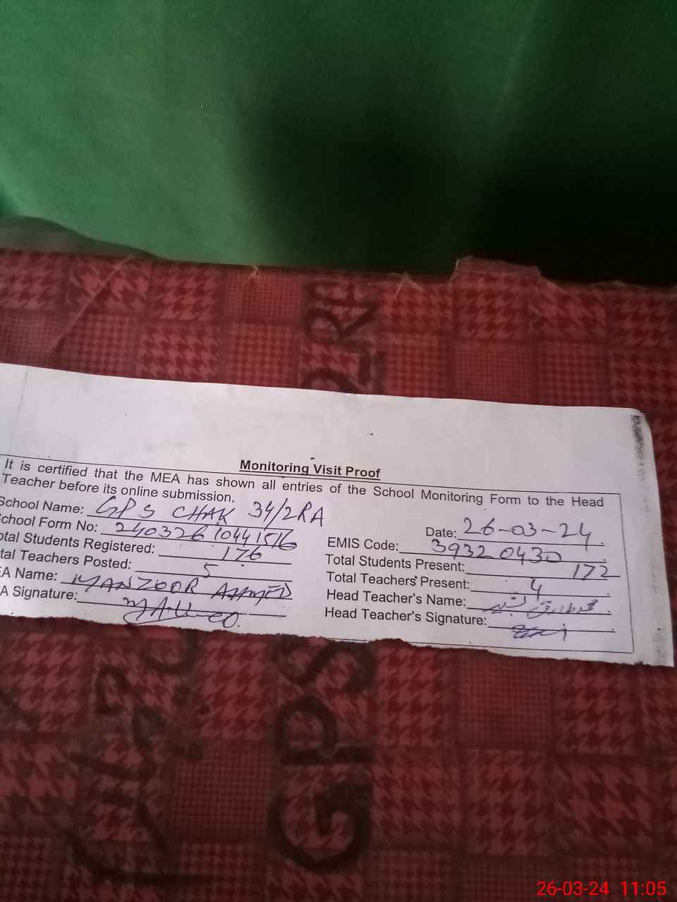 | EMIS Code: 39320430 | Name of School: GPS CHAK NO. 34/ 2-RA | |||