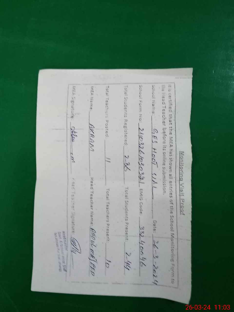 | Attendance Register | Head Teacher | MEA with School | Visit Proof |