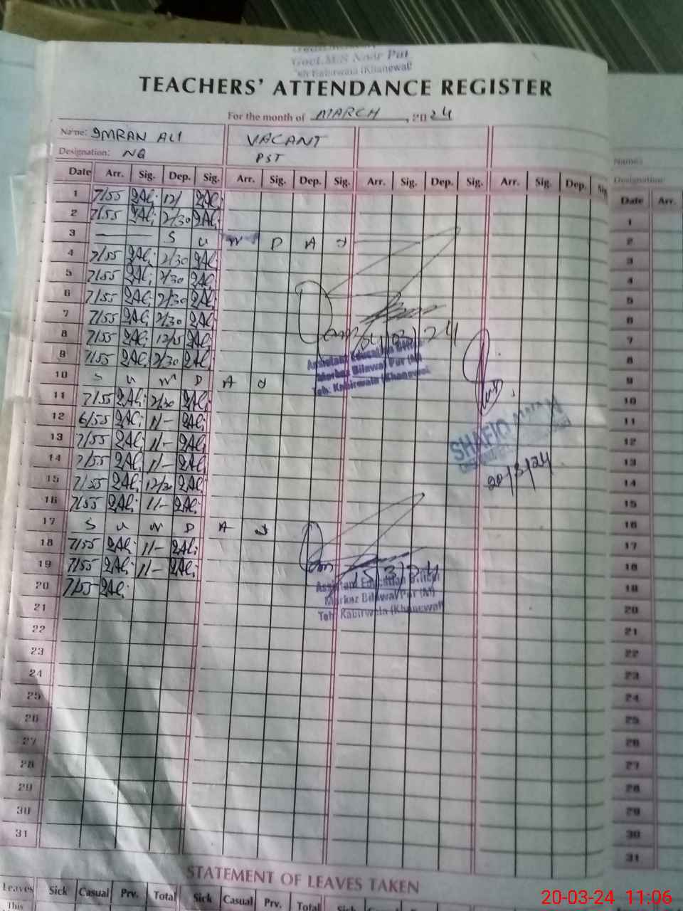 | 36**** | Mu**** Ra**** | EST | Regular | 0 | 0 | 0 | 0 | 0 | 0 | 0 | 0 | 0 | Exam Duty |